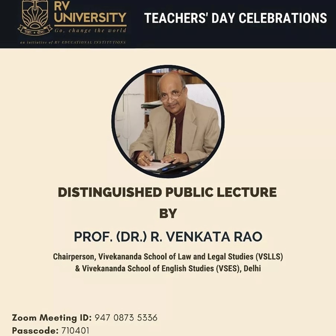Join us on Sunday, 5th September at 11:00 am for a distinguished public lecture by Prof. (Dr.) R. Venkata Rao, Chairperson, Vivekananda School of Law and Legal Studies (VSLLS) & Vivekananda School of English Studies (VSES) on the occasion of Teachers
